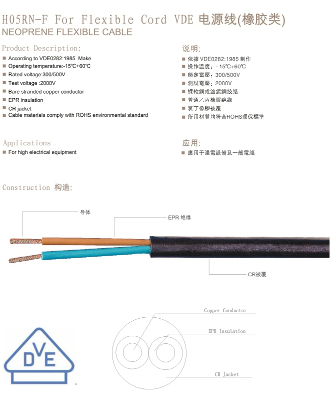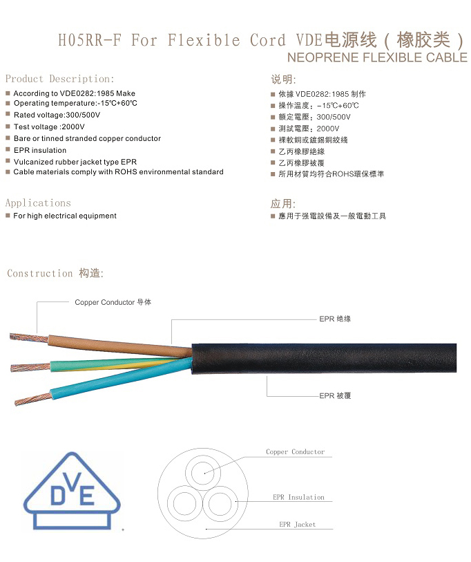 VDE认证 H05RN-F H05RR-F 橡胶线