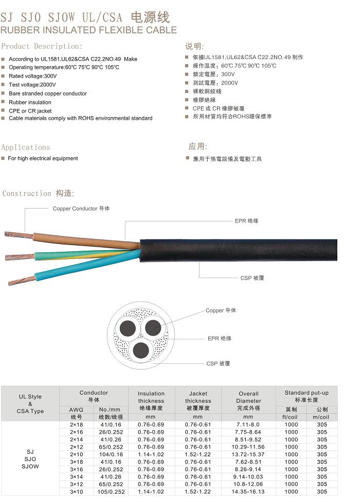 美国UL认证橡胶线SJ/SJO/SOW/SOO…