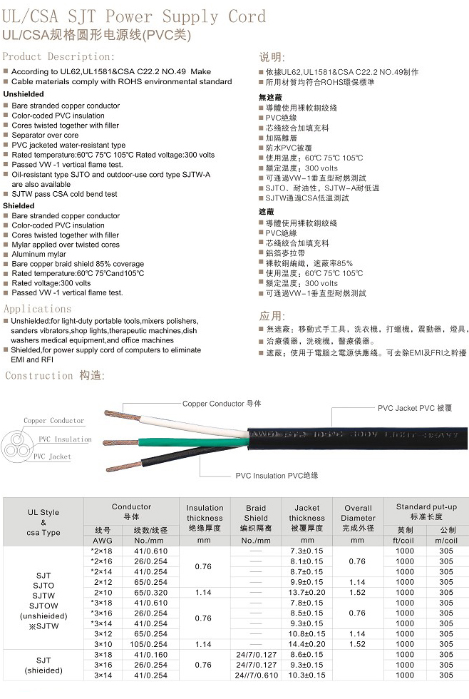 美国UL认证电源线SJT/SJTW/SJTOW