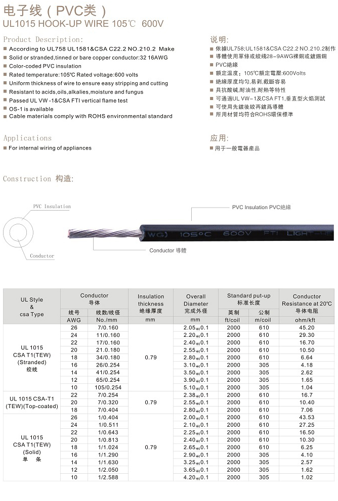 美国UL聚氯乙烯PVC线电线电缆列表