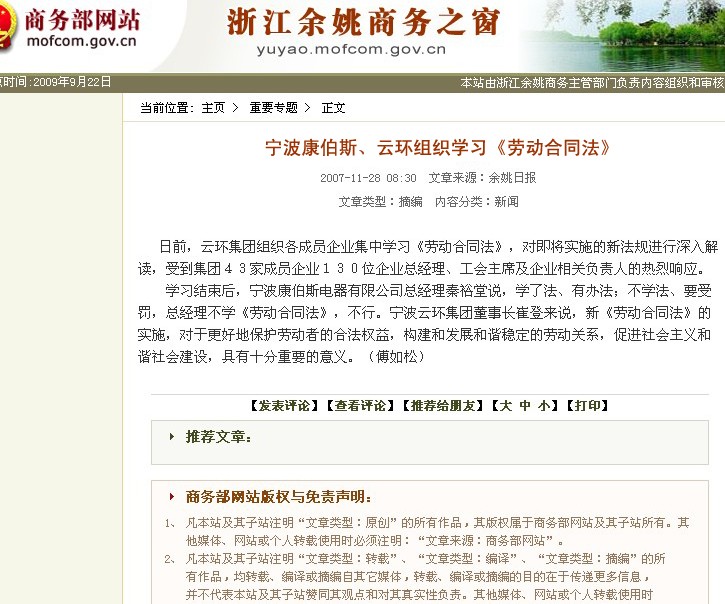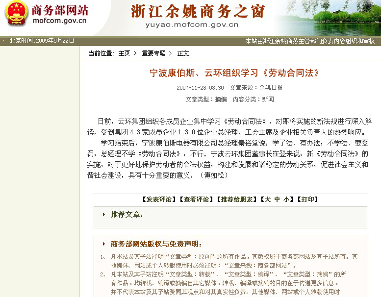 商务部:宁波康伯斯电器有限公司组织学习《劳动合同法》
